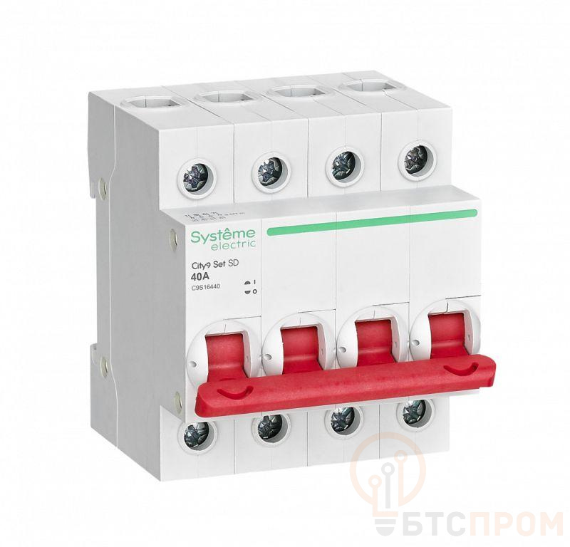 Выключатель-разъединитель серии City9 Set Systeme Electric, 4-полюсный, номинальный ток 40 А, с красной рукояткой управления. Предназначен для включения и отключения нагрузок в электрических сетях напряжением 400 В. Категория применения AC-22A. Двойной разрыв цепи обеспечивает гарантированное отключение питания и отсутствие сваривания контактов. Крепление на DIN-рейку шириной 35 мм.
