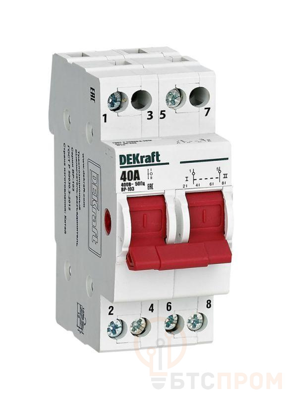 Выключатель-разъединитель трехпозиционный серии ВР-103 Dekraft, 2-полюсный; номинальный ток 40 А, установка – на 35мм DIN-рейку, установочное положение - любое, с красной рукояткой управления. Категория применения AC-22B. Применяется для ручного включения / отключения от сети отдельных групп потребителей с напряжением 400В AC в распределительных, учетно-распределительных щитках. Включая переключения с основной сети на резервную в системах ручного ввода резерва. Сечение подключаемых проводников 10 мм2, расположение - в шахматном порядке.
