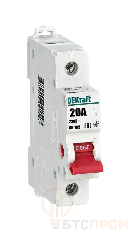 Выключатель-разъединитель серии ВН-105 Dekraft, 1-полюсный; номинальный ток 20 А, установка – на 35мм DIN-рейку, установочное положение - любое, с красной рукояткой управления. Высокие характеристики механической и электрической износостойкости. Категория применения AC-22A. Применяется для ручного включения/отключения сетей напряжением 230 В AC. Специальные мостиковые контакты обеспечивают надежный разрыв цепи; они полностью исключают возможность перекрытия дугой по изоляции.