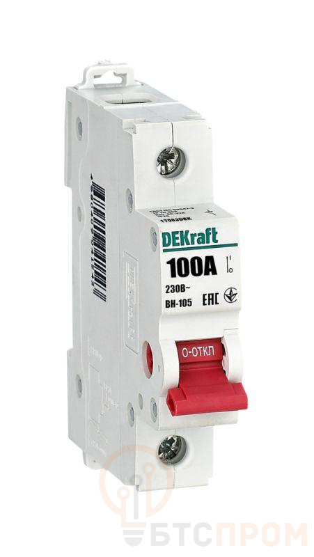 Выключатель-разъединитель серии ВН-105 Dekraft, 1-полюсный; номинальный ток 100 А, установка – на 35мм DIN-рейку, установочное положение - любое, с красной рукояткой управления. Высокие характеристики механической и электрической износостойкости. Категория применения AC-22A. Применяется для ручного включения/отключения сетей напряжением 230 В AC. Специальные мостиковые контакты обеспечивают надежный разрыв цепи; они полностью исключают возможность перекрытия дугой по изоляции.