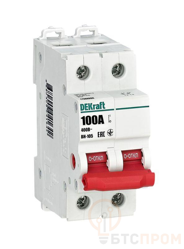 Выключатель-разъединитель серии ВН-105 Dekraft, 2-полюсный; номинальный ток 100 А, установка – на 35мм DIN-рейку, установочное положение - любое, с красной рукояткой управления. Высокие характеристики механической и электрической износостойкости. Категория применения AC-22A. Применяется для ручного включения/отключения сетей напряжением 230 В AC. Специальные мостиковые контакты обеспечивают надежный разрыв цепи; они полностью исключают возможность перекрытия дугой по изоляции.