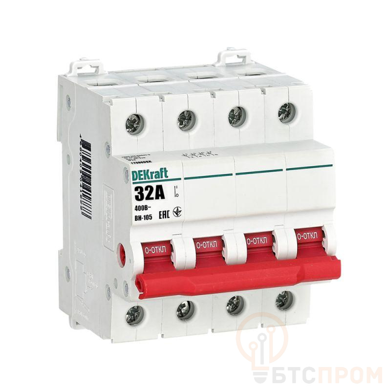 Выключатель-разъединитель серии ВН-105 Dekraft, 4-полюсный; номинальный ток 32 А, установка – на 35мм DIN-рейку, установочное положение - любое, с красной рукояткой управления. Высокие характеристики механической и электрической износостойкости. Категория применения AC-22A. Применяется для ручного включения/отключения сетей напряжением 400 В AC. Специальные мостиковые контакты обеспечивают надежный разрыв цепи; они полностью исключают возможность перекрытия дугой по изоляции.