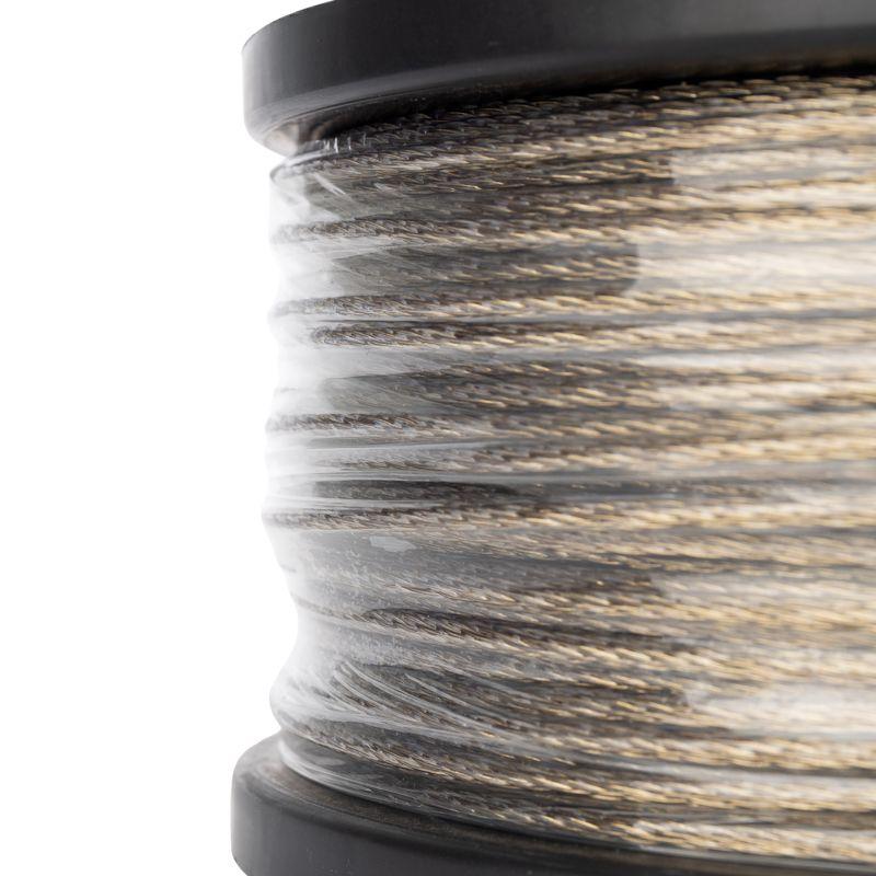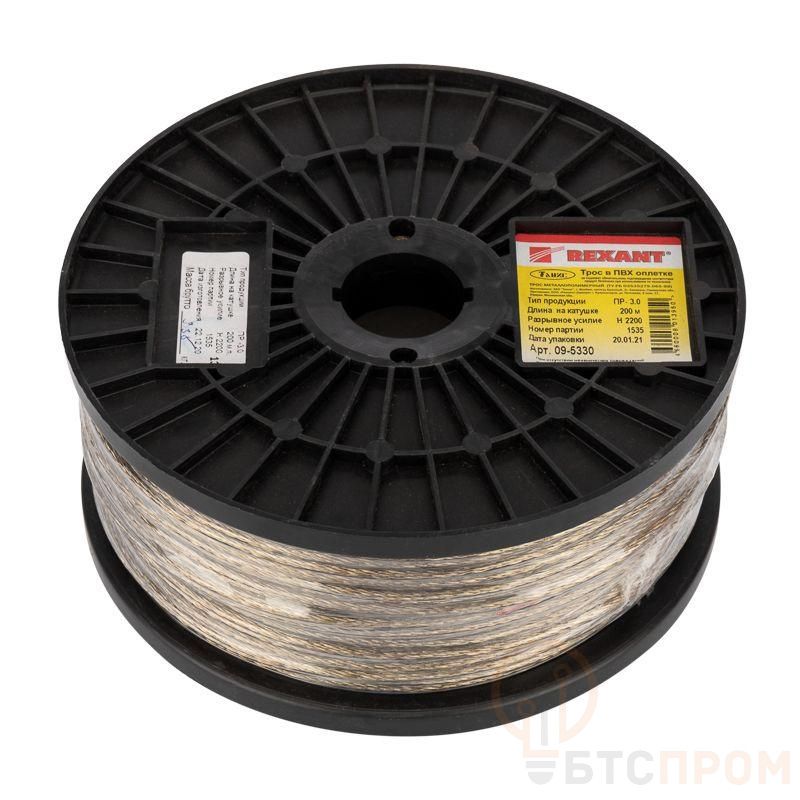 Стальной трос с полимерным покрытием используется для монтажа рекламных растяжек, систем освещения, новогодних конструкций и украшений. Применяется при организации ограждений, а также при оборудовании парников и теплиц. Предназначен для использования при статических нагрузках. Стальной трос свивается из высокоуглеродистой латунированной стальной проволоки и покрывается ПВХ, что обеспечивает устойчивость к воздействию влаги и пресной воды. ПВХ покрытие является экологически чистым и абсолютно безопасным материалом для человека и животных. Срок службы троса составляет более 25 лет (при отсутствии механических повреждений покрытия). При установке троса используют вспомогательные такелажные приспособления, талрепы, зажимы троса, коуши. Диаметр с покрытием: 3,0±0,1 мм. Диаметр без покрытия: 1,10-2,10 мм. Мин. разрывное усилие: 2 200 Н/220 кг.