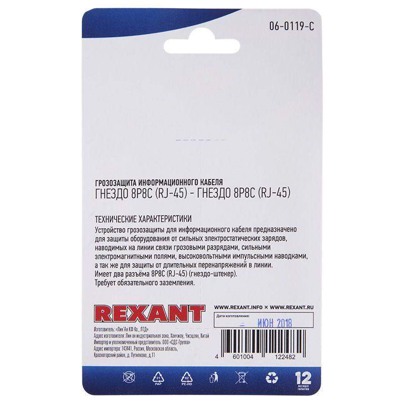 Грозозащита информационного кабеля (гнездо 8Р8С (Rj-45)-гнездо 8Р8С (Rj-45)) с PoE (блист.) Rexant 06-0119-C