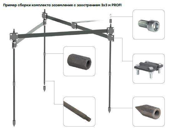 Комплект заземления с заострением 3х3м PROFI является готовым решением для организации треугольника заземления. Комплект включает в себя: стальные стержни в термодиффузионном цинковании D=16мм длиной 1500мм - 6 шт., стальная полоса в термодиффузионном цинковании 4х40мм длиной 1500мм - 3 шт., зажимы для подключения проводников - 7 шт., муфты соединительные - 3 шт., винт ударный и гайка для забивания, насадка SDS-max, перчатки для удобства монтажа, пасту контактную, ленту гидроизоляционную, паспорт на изделие. Монтаж производится с помощью болтовых соединений, без сварки.