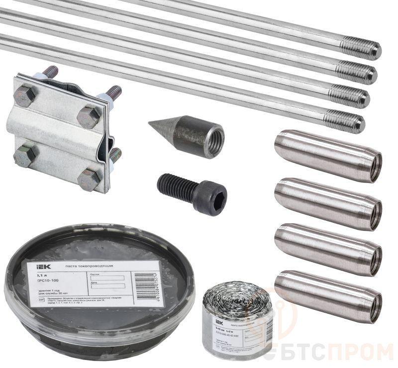 Комплект заземления товарного знака IEK используется для организации заземляющего устройства жилых объектов, объектов энергетического и промышленного комплексов, объектов связи. Данный комплект монтируется на глубину 6 метров путём последовательного соединения и заглубления стержней с помощью перфоратора или кувалды. Стержни комплекта имеют резьбу на обоих концах и соединяются между собой посредством муфт. Для обеспечения надёжного электрического контакта места соединения смазывают токопроводящей пастой. При монтаже в муфту, с противоположной стороны от стержня, вкручивается удароприёмная головка, которая принимает на себя энергию ударного молотка, не допуская деформации стержней заземления и соединительной муфты, в которую плотно вкручивается. Верхний заземлитель подключают с помощью зажима к горизонтальному проводнику системы молниезащиты. Данное соединение сверху закрывают изоляционной лентой для защиты от попадания влаги и образования коррозии.