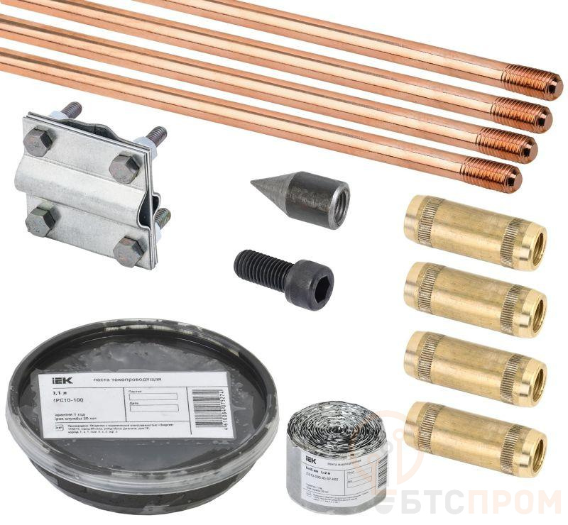 Комплект заземления товарного знака IEK используется для организации заземляющего устройства жилых объектов, объектов энергетического и промышленного комплексов, объектов связи. Данный комплект монтируется на глубину 6 метров путём последовательного соединения и заглубления стержней с помощью перфоратора или кувалды. Стержни комплекта имеют резьбу на обоих концах и соединяются между собой посредством муфт. Для обеспечения надёжного электрического контакта места соединения смазывают токопроводящей пастой. При монтаже в муфту, с противоположной стороны от стержня, вкручивается удароприёмная головка, которая принимает на себя энергию ударного молотка, не допуская деформации стержней заземления и соединительной муфты, в которую плотно вкручивается. Верхний заземлитель подключают с помощью зажима к горизонтальному проводнику системы молниезащиты. Данное соединение сверху закрывают изоляционной лентой для защиты от попадания влаги и образования коррозии.