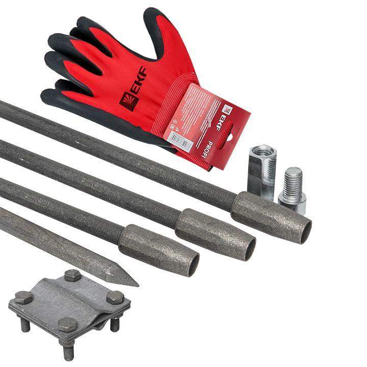 Комплекты заземления предназначены для устройства защитного заземления электроустановок и оборудования, организации заземления молниезащиты. Данный комплект включает в себя: стальные стержни в термодиффузионном цинковании D=16мм длиной 1500мм - 4 шт., муфта соединительная - 3 шт., зажим для подключения проводников, винт ударный и гайка для забивания, перчатки для удобства монтажа, паспорт на изделие.