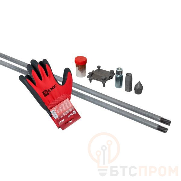 Комплекты заземления предназначены для устройства защитного заземления электроустановок и оборудования, организации заземления молниезащиты. Данный комплект включает в себя: стальные стержни в термодиффузионном цинковании D=16мм длиной 1500мм - 2 шт., наконечник заземлителя - 1 шт., муфта соединительная - 1 шт., зажим для подключения проводников, винт ударный и гайка для забивания, перчатки для удобства монтажа, паспорт на изделие.