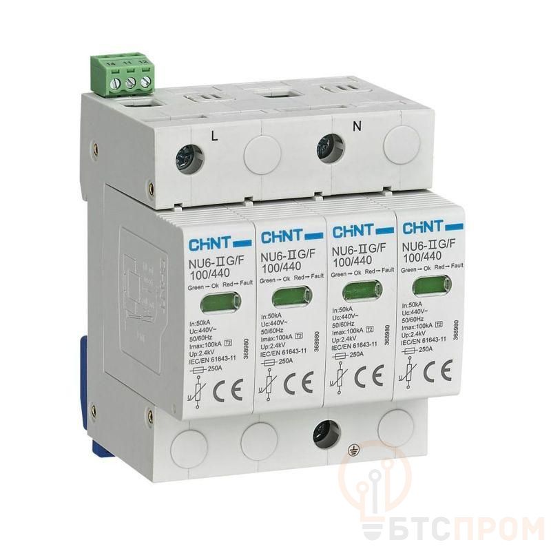 Ограничители импульсных перенапряжений серии NU6-IIG предназначены для защиты от повреждения грозовым разрядом и аварийными скачками напряжения любых чувствительных к перенапряжениям устройств. Они могут применяться в сетях с системами заземления: TN, TT, IT. Ограничители перенапряжения протестированы ударной волной 8/20 мкс. Основные характеристики: Количество полюсов – 1P, 2P, 3P, 4P Номинальное рабочее напряжение – АС240/415В Номинальный разрядный ток – 15 кА, 25 кА, 40 кА Максимальный разрядный ток – 40 кА, 60 кА, 100 кА Исполнение вспомогательных контактов – 1НO+1НЗ Степень загрязнения – 2 Степень защиты – IP20 Ширина полюса – 40 и 60кA - 18мм; 100 кА - 36мм Монтаж – на симметричную DIN-рейку 35 мм