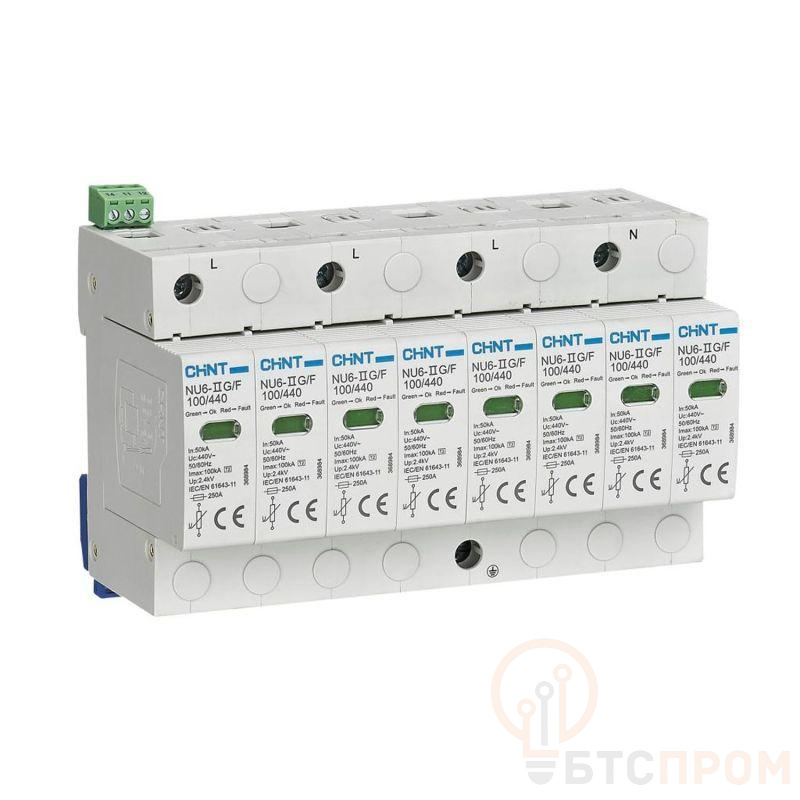 Ограничители импульсных перенапряжений серии NU6-IIG предназначены для защиты от повреждения грозовым разрядом и аварийными скачками напряжения любых чувствительных к перенапряжениям устройств. Они могут применяться в сетях с системами заземления: TN, TT, IT. Ограничители перенапряжения протестированы ударной волной 8/20 мкс. Основные характеристики: Количество полюсов – 1P, 2P, 3P, 4P Номинальное рабочее напряжение – АС240/415В Номинальный разрядный ток – 15 кА, 25 кА, 40 кА Максимальный разрядный ток – 40 кА, 60 кА, 100 кА Исполнение вспомогательных контактов – 1НO+1НЗ Степень загрязнения – 2 Степень защиты – IP20 Ширина полюса – 40 и 60кA - 18мм; 100 кА - 36мм Монтаж – на симметричную DIN-рейку 35 мм
