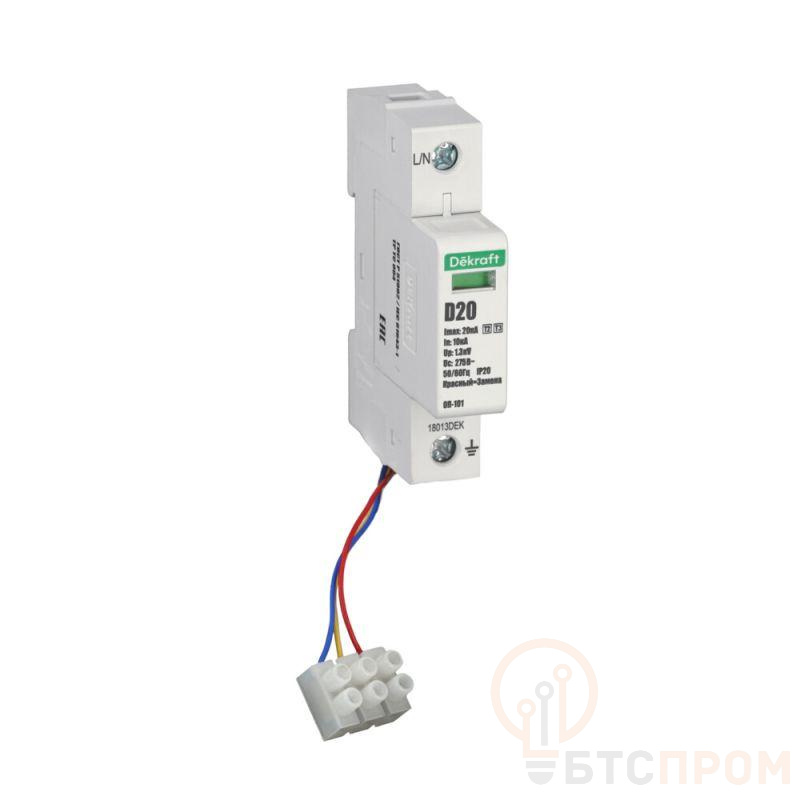 Ограничитель перенапряжения серии ОП-101 Dekraft ; 1P; макс.разрядный ток 20 кА; мак.рабочее напряжение 275 В; класс 3(D); монтаж – на DIN-рейку; ширина – 1 модуль х 18 мм. Ограничители срабатывают за миллиардную долю секунды и надежно защищают оборудование от бросков напряжения. Повышенный уровень защиты позволяет ограничить перенапряжения до 1,3 кВ. Ограничитель оснащён сигнальным контактом. Применяются во ВРУ, ГРЩ, распределительных щитках, коробках и непосредственно возле аппаратов.