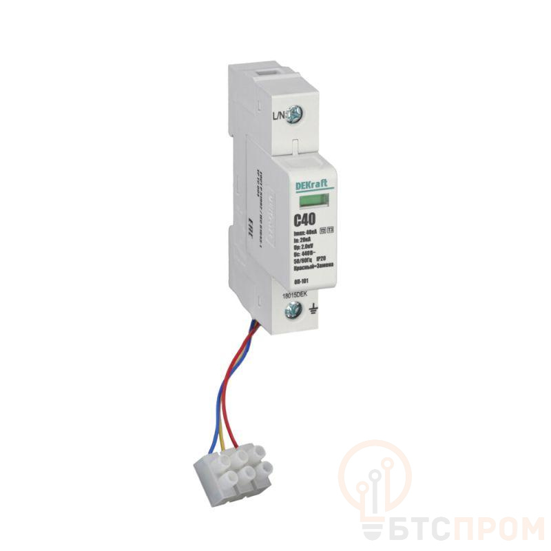Ограничитель перенапряжения серии ОП-101 Dekraft ; 1P; макс.разрядный ток 40 кА; мак.рабочее напряжение 440 В; класс 2(C); монтаж – на DIN-рейку; ширина – 1 модуль х 18 мм. Ограничители срабатывают за миллиардную долю секунды и надежно защищают оборудование от бросков напряжения. Повышенный уровень защиты позволяет ограничить перенапряжения до 2 кВ. Ограничитель оснащён сигнальным контактом. Применяются во ВРУ, ГРЩ, распределительных щитках, коробках и непосредственно возле аппаратов.