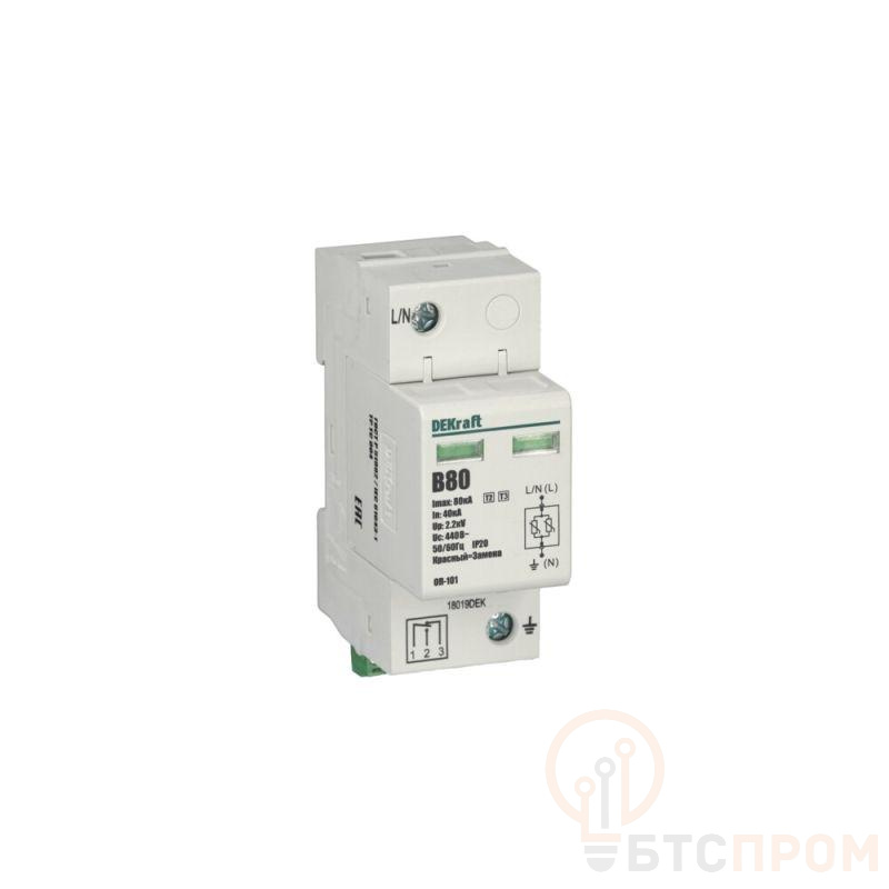 Ограничитель перенапряжения серии ОП-101 Dekraft ; 1P; макс.разрядный ток 80 кА; мак.рабочее напряжение 440 В; класс 1(B); монтаж – на DIN-рейку; ширина – 2 модуля х 36 мм. Ограничители срабатывают за миллиардную долю секунды и надежно защищают оборудование от бросков напряжения. Повышенный уровень защиты позволяет ограничить перенапряжения до 2,2 кВ. Ограничитель оснащён сигнальным контактом. Применяются во ВРУ, ГРЩ, распределительных щитках, коробках и непосредственно возле аппаратов.
