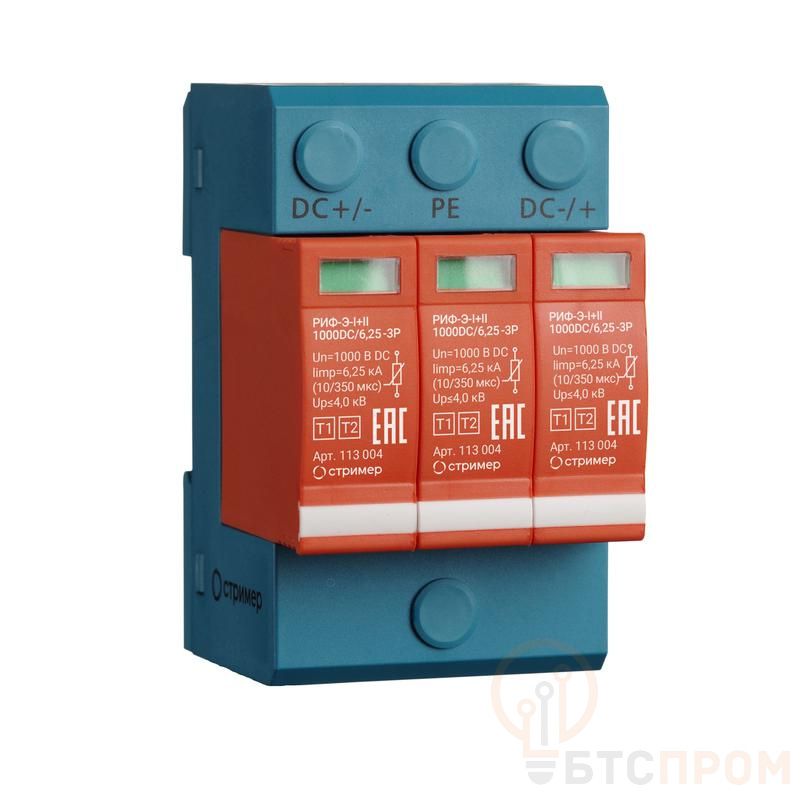 Трёхполюсное УЗИП класса I+II ограничивающего типа. УЗИП выполнено из трёх сменных варисторных модулей и базы для подключения к сети. УЗИП выдерживает токовые нагрузки, соответствующие УЗИП класса I, а по способности ограничения импульсных напряжений, допустимых для изоляции оборудования, соответствует УЗИП класса II. Устанавливается в пределах 0А(В) – 1 зон молниезащиты (в соответствии с ГОСТ Р МЭК 62305-1 и СО-153-34.21.122). Предназначено для защиты двухпроводной системы постоянного тока. Рекомендуемый номинал предохранителя не менее 125 А gL/gG.