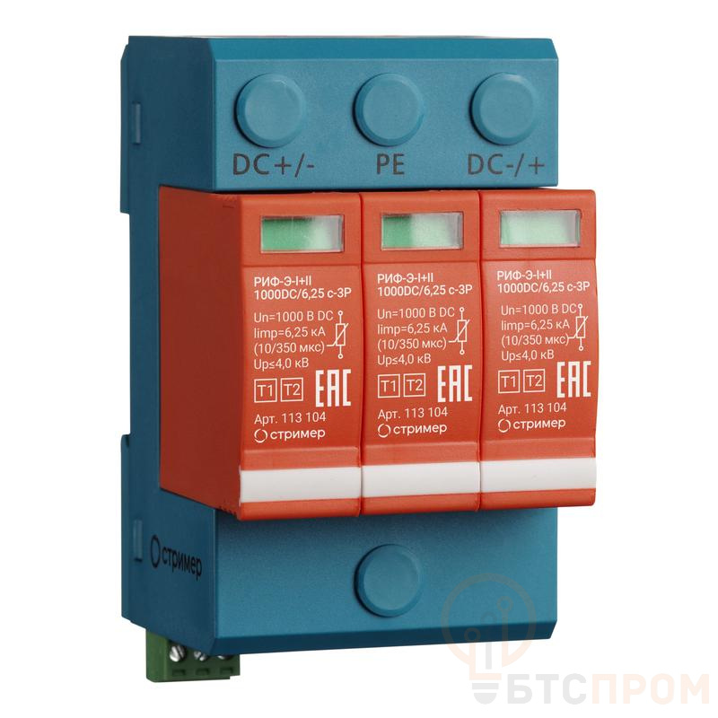 Устройство защиты от импульсных перенапряжений РИФ-Э-I+II 1000DC/6.25 с-3P Стример 113104 фото в каталоге от BTSprom.by