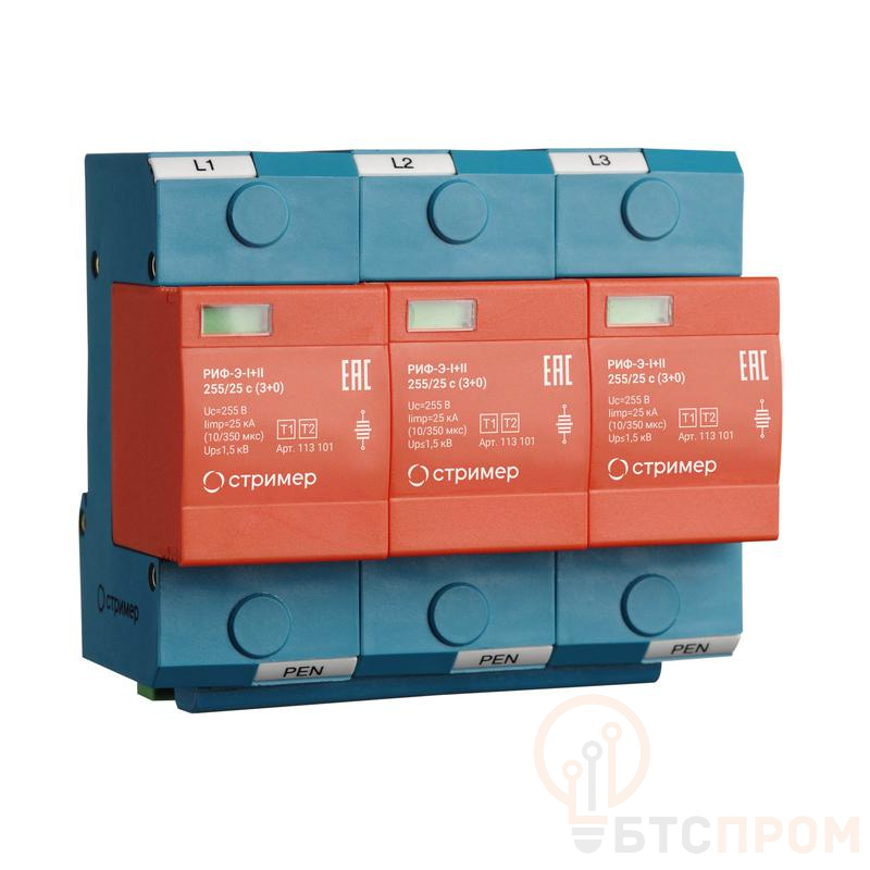 Мощное трехполюсное УЗИП класса I+II коммутирующего типа со сменными рабочими модулями на основе искровых промежутков. УЗИП предназначено для защиты оборудования в низковольтных цепях до 1000 В от прямых и отдаленных молниевых разрядов при воздушном или кабельном вводах электропитания. УЗИП выдерживает токовые нагрузки, соответствующие УЗИП класса I, а по способности ограничения импульсных напряжении?, допустимых для изоляции оборудования, соответствует УЗИП класса II. Оснащено контактами дистанционной сигнализации повреждения рабочего элемента. Устанавливается в пределах 0А(В) – 1 зон молниезащиты (в соответствии с ГОСТ Р МЭК 62305-1 и СО-153-34.21.122). Применяется для сетеи? с системами заземления: TN-C. Предназначено для защиты фазных проводников L/PEN от перенапряжении? «провод-земля». Рекомендуемый номинал предохранителя 200 А gL/gG