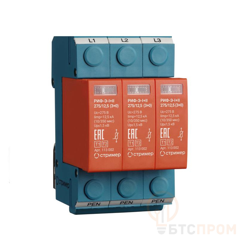 Трехполюсное УЗИП класса I+II ограничивающего типа. УЗИП выполнено в виде трех сменных варисторных модулеи?, и базы для подключения к сети и креплению на DIN-реи?ку 35 мм. УЗИП предназначено для защиты оборудования в низковольтных цепях до 1000 В от прямых и отдаленных молниевых разрядов при воздушном или кабельном вводах электропитания. УЗИП выдерживает токовые нагрузки, соответствующие УЗИП класса I, а по способности ограничения импульсных напряжении?, допустимых для изоляции оборудования, соответствует УЗИП класса II. Устанавливается в пределах 0А(В) – 1 зон молниезащиты (в соответствии с ГОСТ Р МЭК 62305-1 и СО-153-34.21.122). Применяется для сетеи? с системами заземления: TN-C. Рекомендуемый номинал предохранителя 125-200 А gL/gG