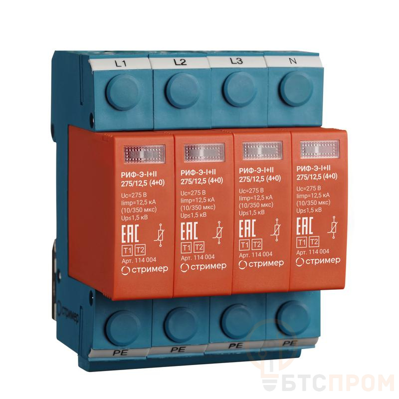 Четырехполюсное УЗИП класса I+II ограничивающего типа. УЗИП выполнено в виде четырех сменных варисторных модулеи?, и базы для подключения к сети и креплению на DIN-реи?ку 35 мм. УЗИП предназначено для защиты оборудования в низковольтных цепях до 1000 В от прямых и отдаленных молниевых разрядов при воздушном или кабельном вводах электропитания. УЗИП выдерживает токовые нагрузки, соответствующие УЗИП класса I, а по способности ограничения импульсных напряжении?, допустимых для изоляции оборудования, соответствует УЗИП класса II. Устанавливается в пределах 0А(В) – 1 зон молниезащиты (в соответствии с ГОСТ Р МЭК 62305-1 и СО-153-34.21.122). Применяется для сетеи? с системами заземления: TN-S. Рекомендуемый номинал предохранителя 125-200 А gL/gG