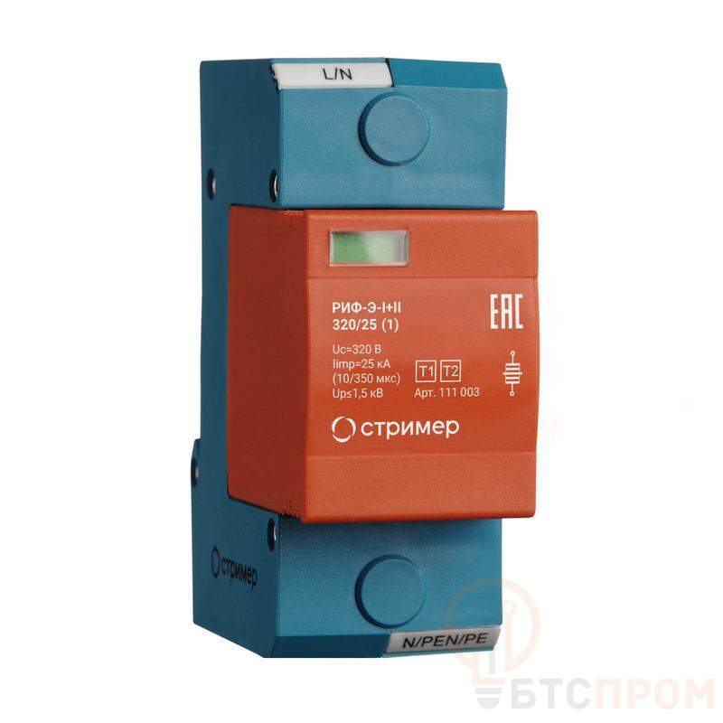 Мощное однополюсное УЗИП класса I+II. Выполненное на основе искровых промежутков УЗИП предназначено для защиты оборудования в низковольтных цепях до 1000 В от прямых и отдаленных молниевых разрядов при воздушном или кабельном вводах электропитания. УЗИП выдерживает токовые нагрузки, соответствующие УЗИП класса I, а по способности ограничения импульсных напряжении?, допустимых для изоляции оборудования, соответствует УЗИП класса II. Устанавливается в пределах 0А(В) – 1 зон молниезащиты (в соответствии с ГОСТ Р МЭК 62305-1 и СО-153-34.21.122). Применяется для сетеи? с любыми системами заземления. Предназначено для защиты фазного или нулевого проводников. Рекомендуемый номинал предохранителя 200 А gL/gG