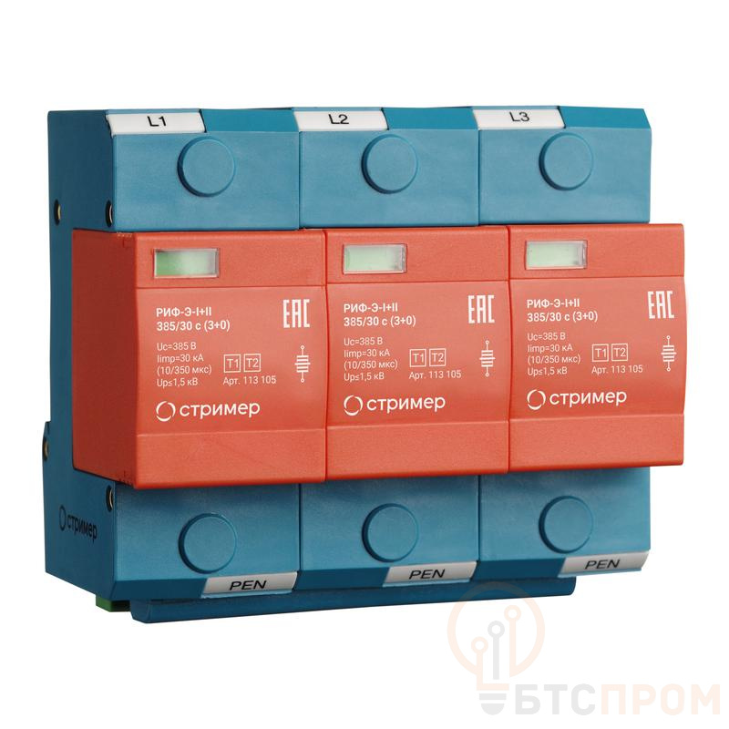 Мощное трехполюсное УЗИП класса I+II коммутирующего типа со сменными рабочими модулями на основе мультиэлектродных газонаполненных разрядников и базы для подключения к сети. УЗИП выдерживает токовые нагрузки, соответствующие УЗИП класса I, а по способности ограничения импульсных напряжений, допустимых для изоляции оборудования, соответствует УЗИП класса II. Устанавливается в пределах 0А(В) – 1 зон молниезащиты (в соответствии с ГОСТ Р МЭК 62305-1 и СО-153-34.21.122). Предназначено для защиты фазных проводников L/PEN от перенапряжений «провод-земля». Рекомендуемый номинал предохранителя не менее 125 А gL/gG. УЗИП снабжено контактами дистанционной сигнализации.