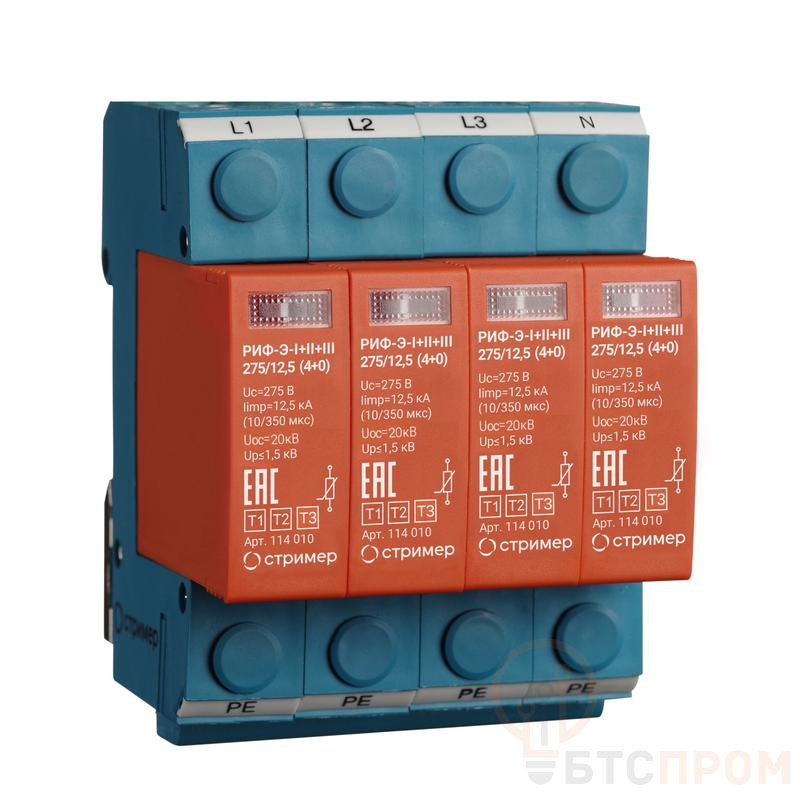 Четырехполюсное УЗИП класса I+II+III ограничивающего типа. УЗИП выполнено в виде четырех сменных варисторных модулеи? и базы для подключения к сети.УЗИП выдерживает токовые нагрузки, соответствующие УЗИП класса I, по способности ограничения импульсных напряжении?, допустимых для изоляции оборудования, соответствует УЗИП класса II и УЗИП класса III.Устанавливается в пределах 0А(В) – 1 зон молниезащиты (в соответствии с ГОСТ Р МЭК 62305-1 и СО-153-34.21.122).Предназначено для защиты фазных и нулевого проводников по схеме подключения L/PE+N/PE («4+0») для защиты от синфазных (провод-земля) перенапряжений.Рекомендуемый номинал предохранителя не менее 125 А gL/gG.