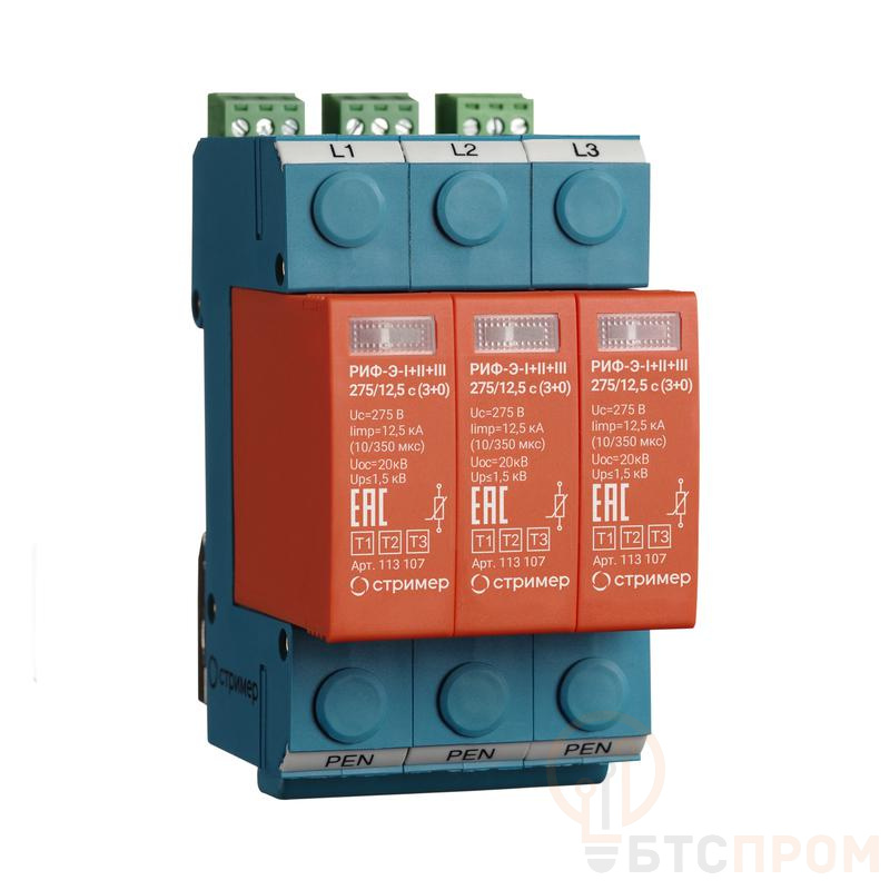 Трехполюсное УЗИП класса I+II+III ограничивающего типа. УЗИП выполнено в виде трех сменных варисторных модулеи?, и базы для подключения к сети. УЗИП выдерживает токовые нагрузки, соответствующие УЗИП класса I, по способности ограничения импульсных напряжении?, допустимых для изоляции оборудования, соответствует УЗИП класса II и УЗИП класса III.Устанавливается в пределах 0А(В) – 1 зон молниезащиты (в соответствии с ГОСТ Р МЭК 62305-1 и СО-153-34.21.122).Рекомендуемый номинал предохранителя не менее 125 А gL/gG.