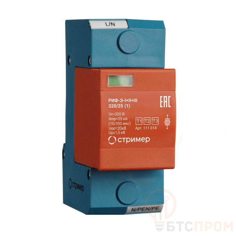 Мощное однополюсное УЗИП класса I+II+III коммутирующего типа со сменным модулем на основе мультиэлектродного газонаполненного разрядника и базы для подключения к сети.УЗИП выдерживает токовые нагрузки, соответствующие УЗИП класса I, по способности ограничения импульсных напряжении?, допустимых для изоляции оборудования, соответствует УЗИП класса II и УЗИП класса III.Устанавливается в пределах 0А(В) – 1 зон молниезащиты (в соответствии с ГОСТ Р МЭК 62305-1 и СО-153-34.21.122). Предназначено для защиты фазного проводника L/N, L/PEN, L/PE.Возможно подключение УЗИП для защиты нулевого проводника по схеме N/PE.Рекомендуемый номинал предохранителя не менее 125 А gL/gG/