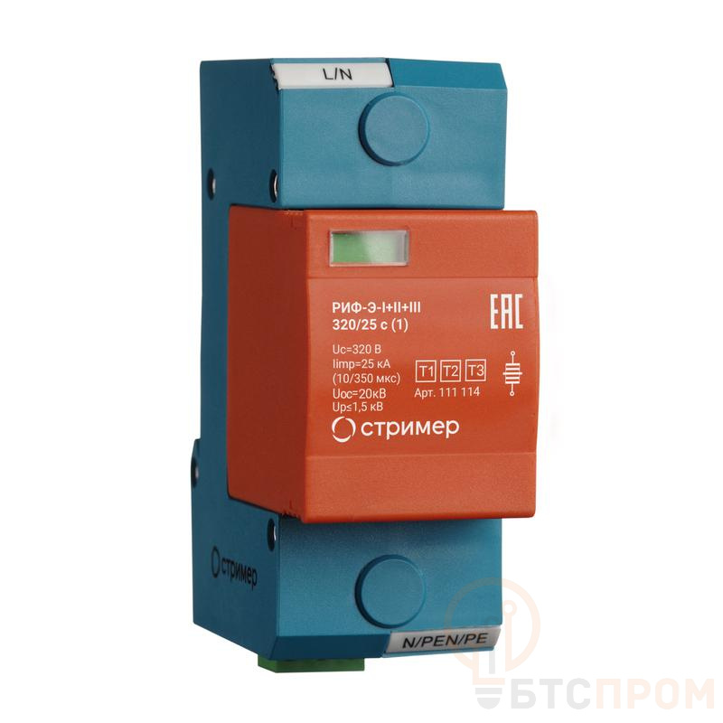 Мощное однополюсное УЗИП класса I+II+III коммутирующего типа со сменным модулем на основе мультиэлектродного газонаполненного разрядника и базы для подключения к сети.УЗИП выдерживает токовые нагрузки, соответствующие УЗИП класса I, по способности ограничения импульсных напряжении?, допустимых для изоляции оборудования, соответствует УЗИП класса II и УЗИП класса III.Устанавливается в пределах 0А(В) – 1 зон молниезащиты (в соответствии с ГОСТ Р МЭК 62305-1 и СО-153-34.21.122). Предназначено для защиты фазного проводника L/N, L/PEN, L/PE.Возможно подключение УЗИП для защиты нулевого проводника по схеме N/PE.Рекомендуемый номинал предохранителя не менее 125 А gL/gG/