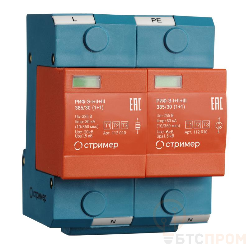 Мощное двухполюсное УЗИП класса I+II+III коммутирующего типа со сменными рабочими модулями на основе мультиэлектродного и двухэлектродного газонаполненного разрядника и базы для подключения к сети.УЗИП выдерживает токовые нагрузки, соответствующие УЗИП класса I, по способности ограничения импульсных напряжении?, допустимых для изоляции оборудования, соответствует УЗИП класса II и УЗИП класса III.Устанавливается в пределах 0А(В) – 1 зон молниезащиты (в соответствии с ГОСТ Р МЭК 62305-1 и СО-153-34.21.122).Предназначено для защиты фазного и нулевого проводников от перенапряжений «провод-провод».Рекомендуемый номинал предохранителя не менее 125 А gL/gG.
