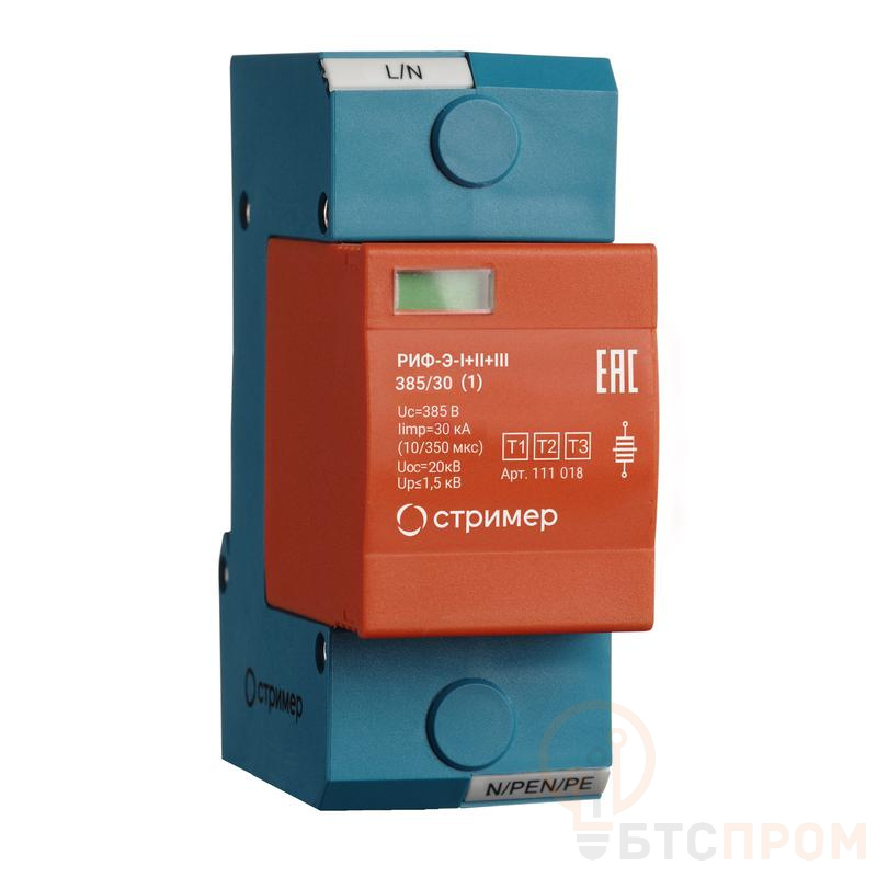 Мощное однополюсное УЗИП класса I+II+III коммутирующего типа со сменным модулем на основе мультиэлектродного газонаполненного разрядника и базы для подключения к сети.УЗИП выдерживает токовые нагрузки, соответствующие УЗИП класса I, по способности ограничения импульсных напряжении?, допустимых для изоляции оборудования, соответствует УЗИП класса II и УЗИП класса III.Устанавливается в пределах 0А(В) – 1 зон молниезащиты (в соответствии с ГОСТ Р МЭК 62305-1 и СО-153-34.21.122).Предназначено для защиты фазного проводника L/N, L/PEN, L/PE.Возможно подключение УЗИП для защиты нулевого проводника по схеме N/PE. Рекомендуемый номинал предохранителя не менее 125 А gL/gG