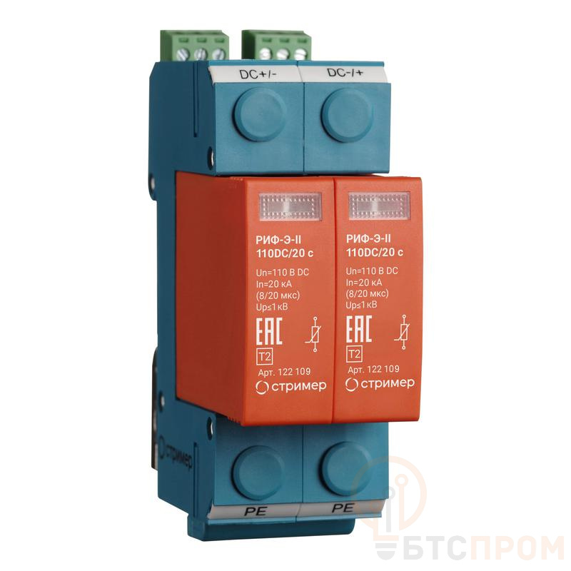 Двухполюсное УЗИП класса II комбинированного типа с контактом дистанционной сигнализации. УЗИП выполнено в виде двух варисторных сменных модулей и базы для подключения к сети и креплению на DIN-рейку 35 мм. Устанавливается в пределах 1-2 зон молниезащиты (в соответствии с ГОСТ Р МЭК 62305-1 и СО-153-34.21.122) Предназначено для защиты двухпроводной системы постоянного тока. Рекомендуемый номинал предохранителя: 63-125 А gL/gG.
