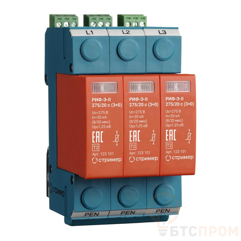 Трехполюсное УЗИП класса II ограничивающего типа. УЗИП выполнено в виде трех сменных варисторных модулей и базы для подключения к сети и креплению на DIN-рейку 35 мм. Оснащено контактами дистанционной сигнализации повреждения рабочего элемента. Cоответствует УЗИП класса испытаний II согласно ГОСТ IEC 61643-2013. Устанавливается в пределах 1 - 2 зон молниезащиты (в соответствии с ГОСТ Р МЭК 62305-1 и СО-153-34.21.122). Применяется для сетей с системами заземления: TN-C. Предназначено для защиты фазных проводников L/PEN от перенапряжений «провод–земля». Рекомендуемый номинал предохранителя 125 А gL/gG
