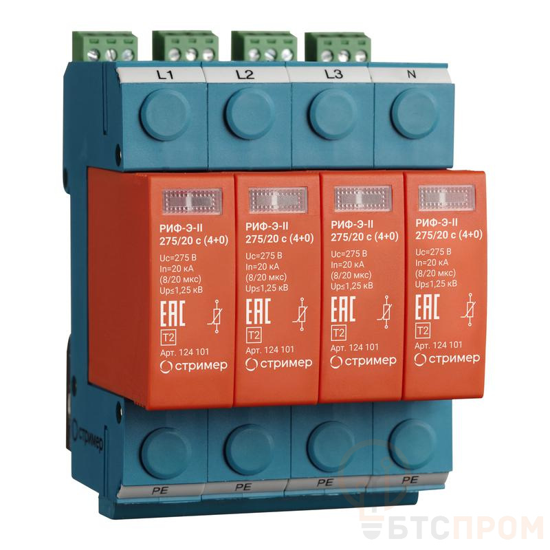 Четырехполюсное УЗИП класса II ограничивающего типа. Выполненное на базе варисторов УЗИП предназначено для организации второй ступени защиты оборудования в низковольтных цепях до 1000 В. УЗИП выполнено в виде четырех сменных варисторных модулей и базы для подключения к сети и креплению на DIN-рейку 35 мм. Оснащено контактами дистанционной сигнализации повреждения рабочего элемента. Cоответствует УЗИП класса испытаний II согласно ГОСТ IEC 61643-2013. Устанавливается в пределах 1 - 2 зон молниезащиты (в соответствии с ГОСТ Р МЭК 62305-1 и СО-153-34.21.122). Применяется для сетей с системами заземления: TN-S. Предназначено для защиты фазного и нулевого проводников L/PE, N/PE от перенапряжений «провод–земля». Рекомендуемый номинал предохранителя 125 А gL/gG