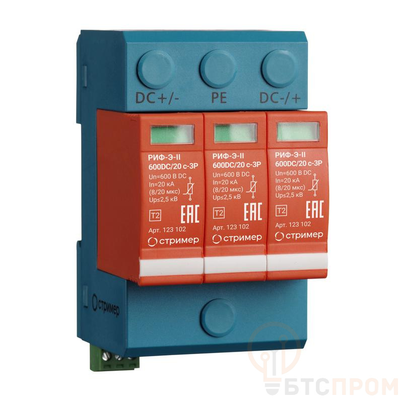 Трёхполюсное УЗИП класса II ограничивающего типа. УЗИП выполнено из трёх сменных варисторных модулей и базы для подключения к сети. Устанавливается в пределах 1 – 2 зон молниезащиты (в соответствии с ГОСТ Р МЭК 62305-1 и СО-153-34.21.122). Предназначено для защиты двухпроводной системы постоянного тока. Рекомендуемый номинал предохранителя не менее 125 А gL/gG. УЗИП снабжено контактами дистанционной сигнализации.