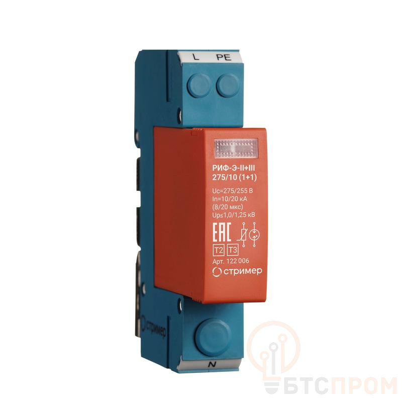 Двухполюсное УЗИП класса II+III комбинированного типа. Предназначено для защиты от вторичных воздействий молнии и коммутационных перенапряжений помехочувствительного оборудования до 1000 В, содержащего электронные схемы. УЗИП выполнено в виде сменного модуля и базы для подключения к сети и креплению на DIN-рейку 35 мм. Рабочими элементами сменного модуля являются варистор и газонаполненный разрядник. Устанавливается в пределах 2-3 зон молниезащиты (в соответствии с ГОСТ Р МЭК 62305-1 и СО-153-34.21.122) непосредственно вблизи защищаемого оборудования. Защищаемое оборудование рекомендуется размещать на расстоянии не более 5 м от УЗИП класса II+III. Применяется для сетей с системами заземления: TN-S, TT. Предназначено для защиты фазного и нулевого проводников от перенапряжений «провод–провод». Рекомендуемый номинал предохранителя 63 А gL/gG.