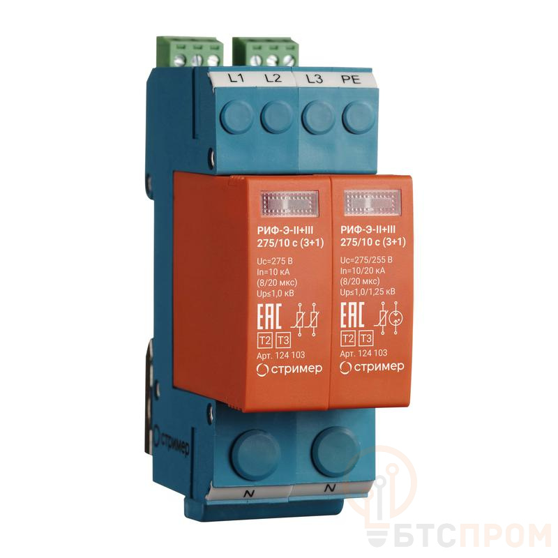 Четырёхполюсное УЗИП класса II+III комбинированного типа. УЗИП выполнено в виде двух сменных модулей и базы для подключения к сети и креплению на DIN-рейку 35 мм. Рабочими элементами сменных модулей являются варистор и газонаполненный разрядник. Оснащено контактами дистанционной сигнализации повреждения рабочего элемента. УЗИП выдерживает токовые нагрузки, соответствующие УЗИП класса II, а по уровню ограничения перенапряжений соответствует УЗИП класса III. Устанавливается в пределах 2-3 зон молниезащиты (в соответствии с ГОСТ Р МЭК 62305-1 и СО-153-34.21.122) непосредственно вблизи защищаемого оборудования. Защищаемое оборудование рекомендуется размещать на расстоянии не более 5 м от УЗИП класса II+III. Применяется для сетей с системами заземления: TN-S, TT. Предназначено для защиты фазного и нулевого проводников L/N, N/PE от перенапряжений «провод–провод». Рекомендуемый номинал предохранителя 63 А gL/gG.