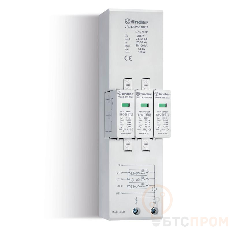 Устройство защиты от импульсных перенапряжений (УЗИП) FINDER 7P048255S007 — это надежное решение для комплексной защиты электрооборудования от грозовых и коммутационных перенапряжений в сетях 255В AC. Устройство относится к классу ограничения Type 1+2, что обеспечивает защиту как от прямых ударов молнии (Type 1), так и от перенапряжений, распространяющихся по сети (Type 2).
