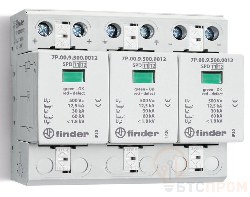 Устройство защиты от импульсных перенапряжений УЗИП тип 1+2 (3 варистора 1000В DC) модульный 108мм IP20 FINDER 7P0390001012