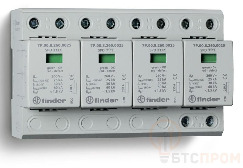 Устройство защиты от импульсных перенапряжений УЗИП тип 1 + 2 (4 варистор/искровый разрядник) модульный 144мм IP20 FINDER 7P0582601025
