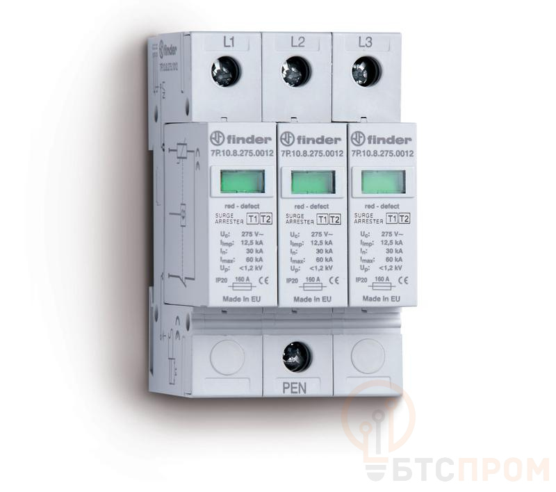 Устройство защиты от импульсных перенапряжений УЗИП тип 1 (3 варистора) модульный 52.5мм IP20 FINDER 7P1382751012