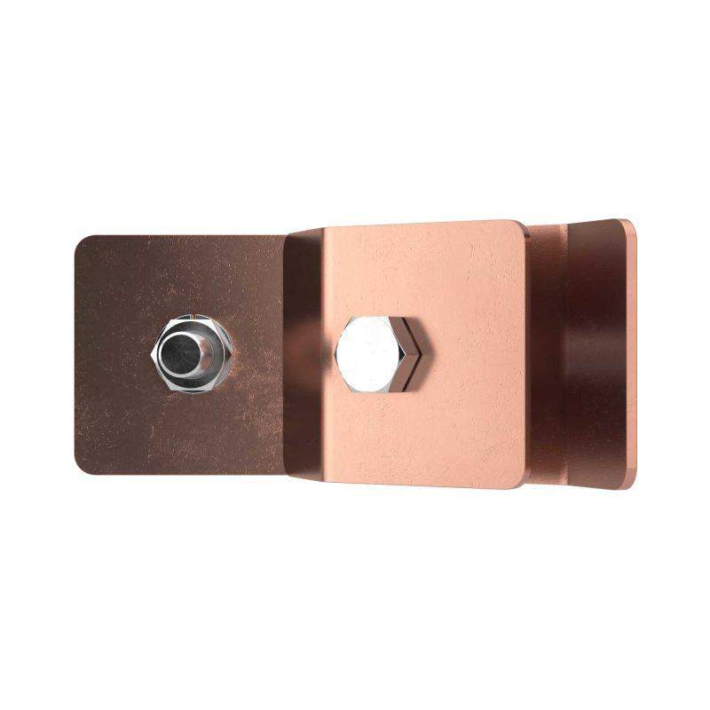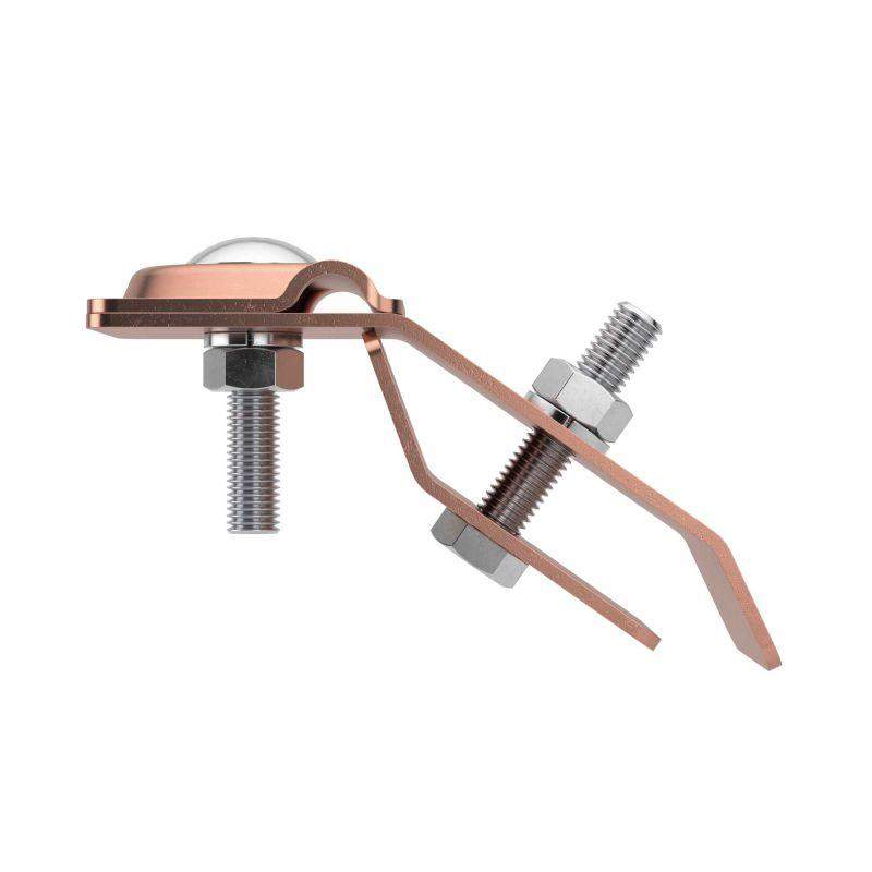 Держатель прутка на водостоке используется для крепления круглого проводника 8-10 мм к водосточным желобам. Конструкция держателя позволяет закреплять пруток как вдоль, так и поперек водостока. Способ крепления проводника - болтовой зажим. Материал - медь.