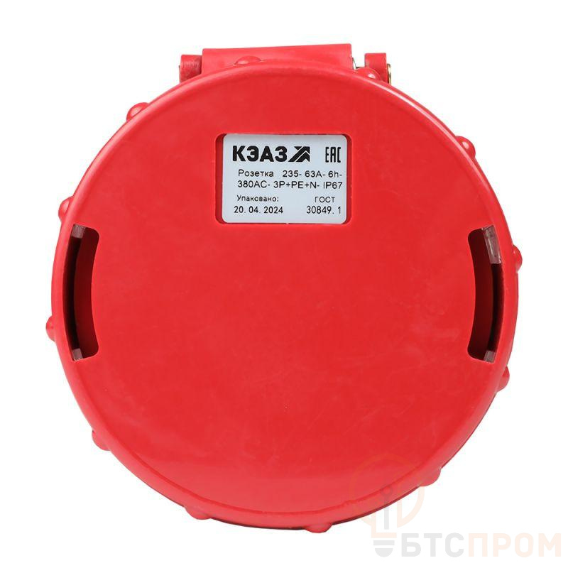 Силовая розетка 5 полюсная на номинальный ток 63 А и номинальное рабочее напряжение переменного тока 380 В.
