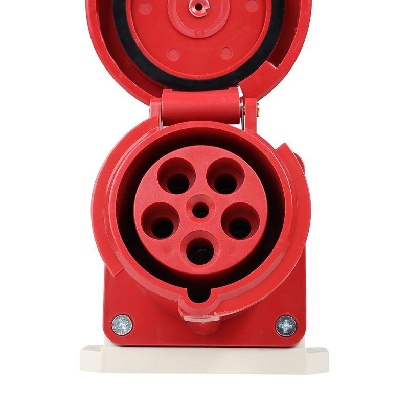Силовая розетка 5 полюсная на номинальный ток 63 А и номинальное рабочее напряжение переменного тока 380 В.